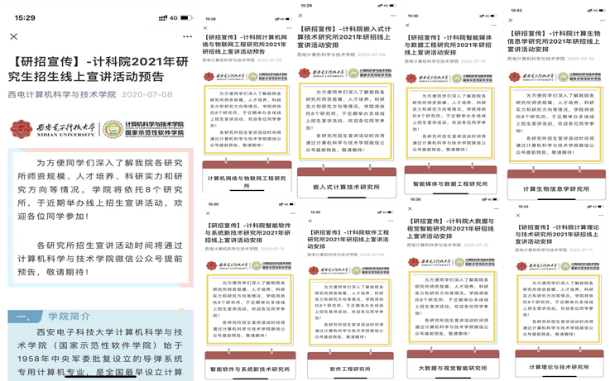 学院高度重视招生宣传工作,提前部署主动出击,全方位、多渠道发力,通过打造专业化宣传队伍、拓宽招生宣传渠道、丰富招生宣传平台等措施扩大学院知名度,提升优质生源比例。打造专业化招生宣传队伍,以学院八个研究所为抓手,组建以专业教师为主体的高水平、专业化的导师宣传队伍,为考生提供最专业化、最权威指导,能够更为有效的吸引优质生源报考。拓宽招生宣传渠道,积极“请进来”,结合学院学科及专业特色,不定期举办各类学术报告会、组织实施优研计划暑期夏令营,吸引优质生源报考;主动“走出去”,组织导师团队开展全国研究生招生校园行宣传,特别是在2020年疫情期间,组织导师团队举办了8场线上专场招生宣讲,学院还参加了2020年CCF研招宣讲,进一步拓宽了考生了解学院途径;丰富招生宣传平台,充分利用校研究生院、学院官微等网络媒体推送学院介绍、招生政策等介绍,进一步扩大宣传范围及效果。此外,学院还重点挖掘本院优质生源,抓平常,加强任课教师、研究生导师、本科班主任与学生的沟通与联系,将学院发展、教育成果、研招政策渗透于平时的学习、生活中,吸引更多本院学生留院读研。通过多途径招生宣传,学院对优质生源的吸引力逐步加大,学院学科专业影响力得到进一步提升。