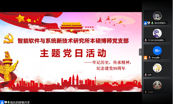 (通讯员 贺同庆)为庆祝建党99周年,重温党的光辉历史,传承弘扬革命先辈的奋斗精神,必赢线路检测3003智能软件与系统新技术研究所本硕博师联合党支部于2020年7月1日召开了“牢记历史,传承精神——庆祝建党99周年”主题党日活动。本次活动由支部青年委员王旭东同志主持,活动共计39人参加,采用腾讯会议线上召开的方式进行。