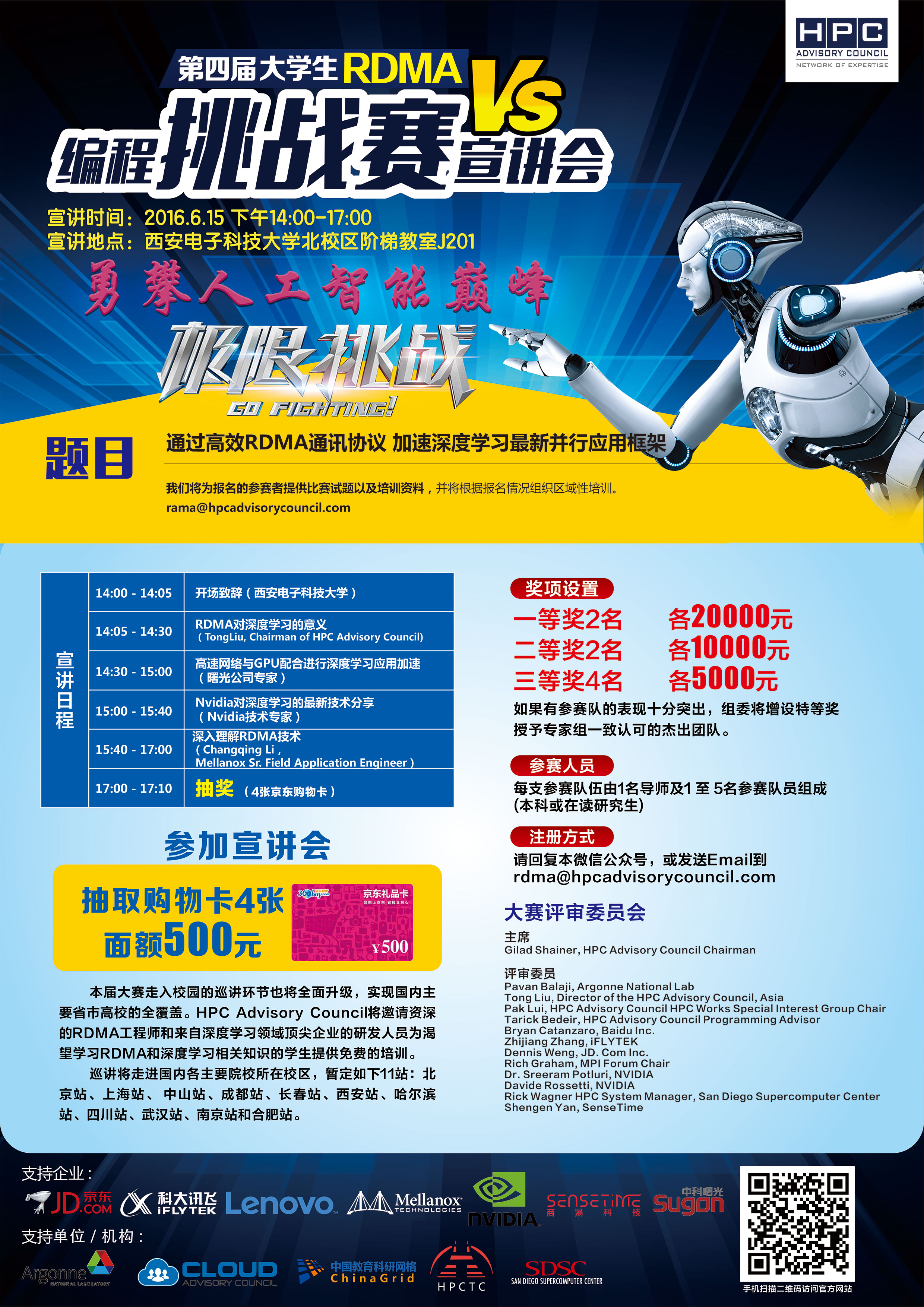 • 大赛即日起开始, 至10月15日结束, 并将于HPC Advisory Council中国研讨会期间(10月26日,西安)举行颁奖典礼。美国知名高校教授与专家将现场颁奖并会向表现优秀学生伸出入读美国名校的橄榄枝。
